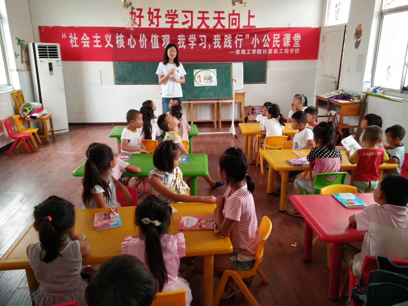 回到教室,“社会主义核心价值观,我学习,我践行”小公民课堂也正式开课。实践队员们用多种多样的方式向小朋友们普及核心价值观二十四个字的含义:在教学“爱国”时,带领大家齐声高唱国歌;在讲解“敬业”时,启发他们体会老师、父母工作的辛苦;小朋友们也积极参与,讲到“诚信”时,一位小男孩主动给大家讲了《狼来了》的故事……在充满趣味的教学中,小朋友们对这二十四个字逐渐熟悉、也加深了印象。