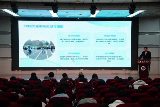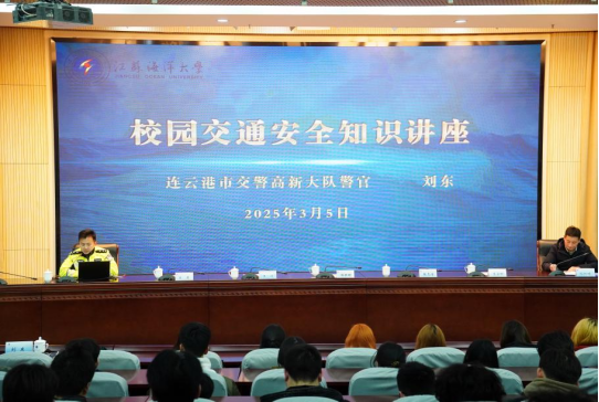 3月5日,活动启动仪式在学术会议中心黄海厅举行。连云港市交警高新大队大队长郭明旺、保卫处、员工工作处及各二级公司师生代表等300余人参加活动。保卫处副处长孙祖皓结合近年来高校交通安全典型案例,系统阐述了校园交通安全工作的重要意义。连云港市公安局交警支队高新大队刘东警官为大家做交通安全知识讲座。刘东通过警示案例视频、法规解读等形式,重点剖析了超速行驶、违规变道等违法行为的危害性,针对校园交通特点,就电动自行车规范骑行、夜间出行安全防护等实用知识进行专业指导。