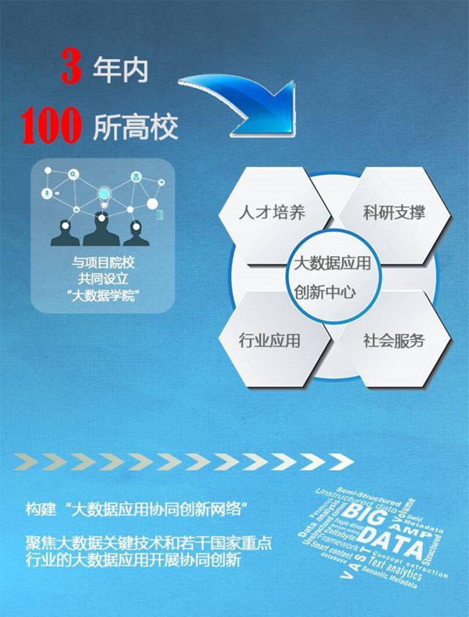 数据中国“百校工程”是教育部公司规划建设发展中心联合曙光信息产业股份有限公司(以下简称中科曙光)发起的产教融合创新项目(以下简称数据中国“百校工程”项目),在全国范围内遴选百所高校,部署集人才培养、科研支撑、行业应用及社会服务于一体的“曙光大数据应用创新中心”,构建“大数据应用协同创新网络”,合作建立“大数据公司”,聚焦大数据关键技术和若干国家重点行业的大数据应用,开展产学研用协同创新,为教育及其它行业提供全方位的数据服务。