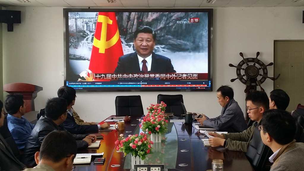 会上,大家首先观看了上午“新一届中央领导集体与记者见面会”的实况转播,接着公司党委副书记姜兵带领大家一起全文学习了人民网10月25日的社论“夺取新时代中国特色社会主义伟大胜利”文章,最后公司党委书记赵耀华带领大家一起学习了十九大报告中关于“新时代中国特色社会主义思想和基本方略”的部分。