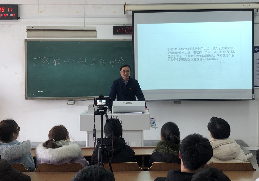 严云洋作为软嵌171班的联系人,非常关心班级状况和同学的成长及日常学习生活。班会伊始,他首先做了自我介绍,并解释了召开此次班会课的初衷,就是想和同学们进行零距离的交流和沟通,并尽其所能指导帮助大家规划好老员工涯。接着他从“老员工涯规划”、“老员工如何合理安排时间”、“计算机专业的就业方向和趋势”等方面,结合自己学习、工作和科研经历,上了一堂别开生面的班会课。
