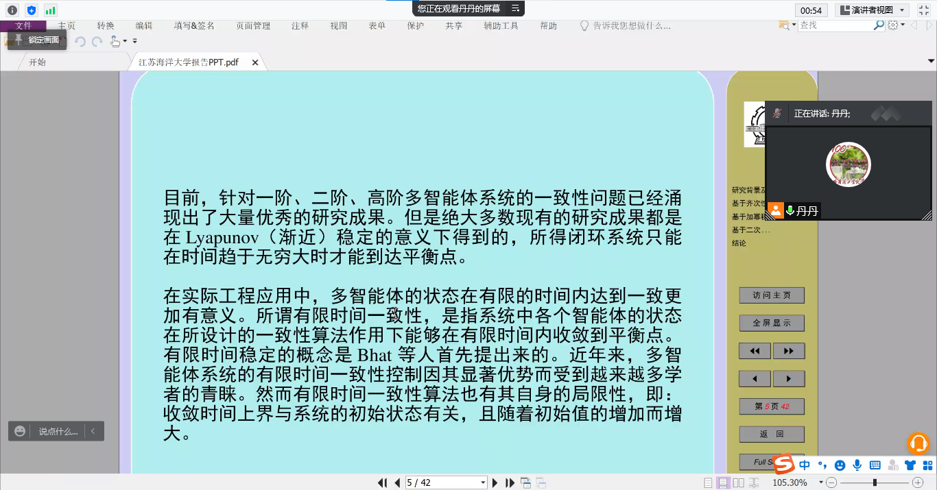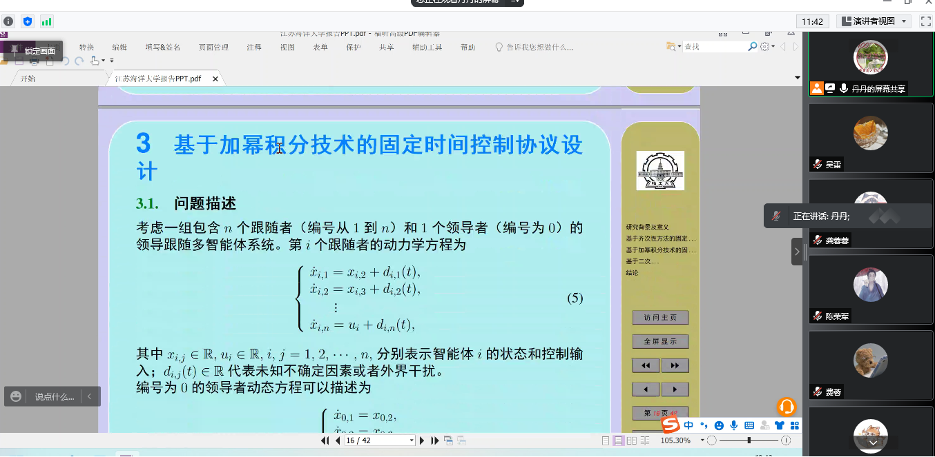首先,张丹丹博士介绍了目前多智能体系统一致性问题的相关研究现状,指出在实际工程应用中,多智能体系统在固定时间内的一致性问题研究更具有意义。