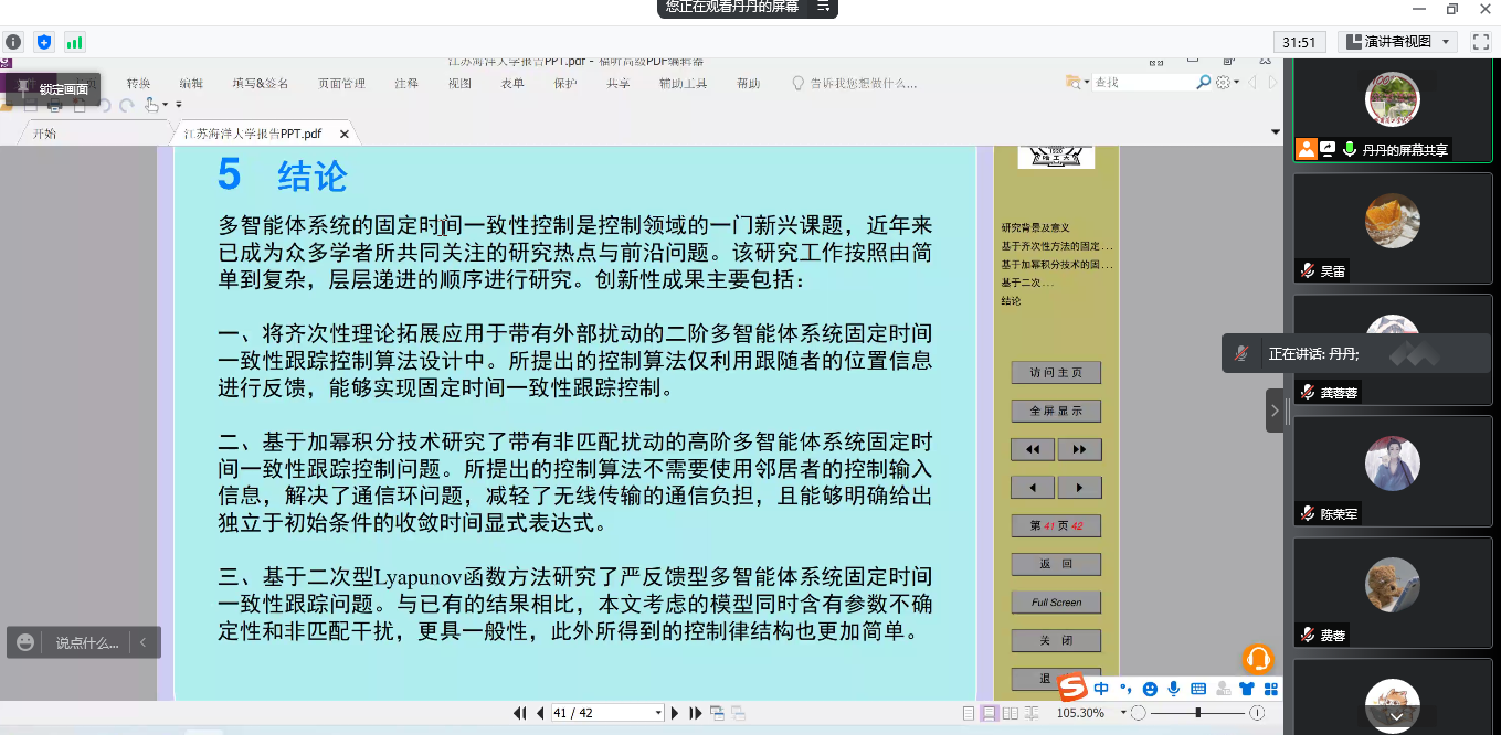 最后,张丹丹博士对多智能体系统的固定时间一致性控制研究课题做出了总结,指出研究工作的几个创新点。