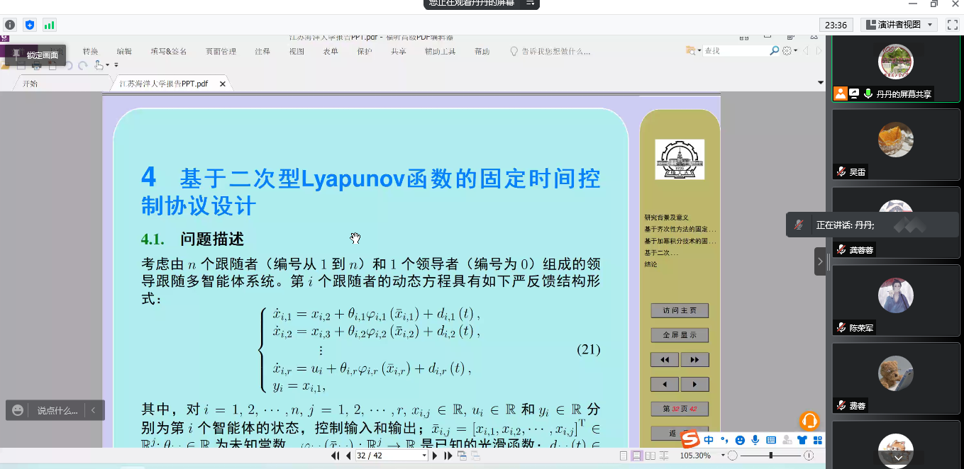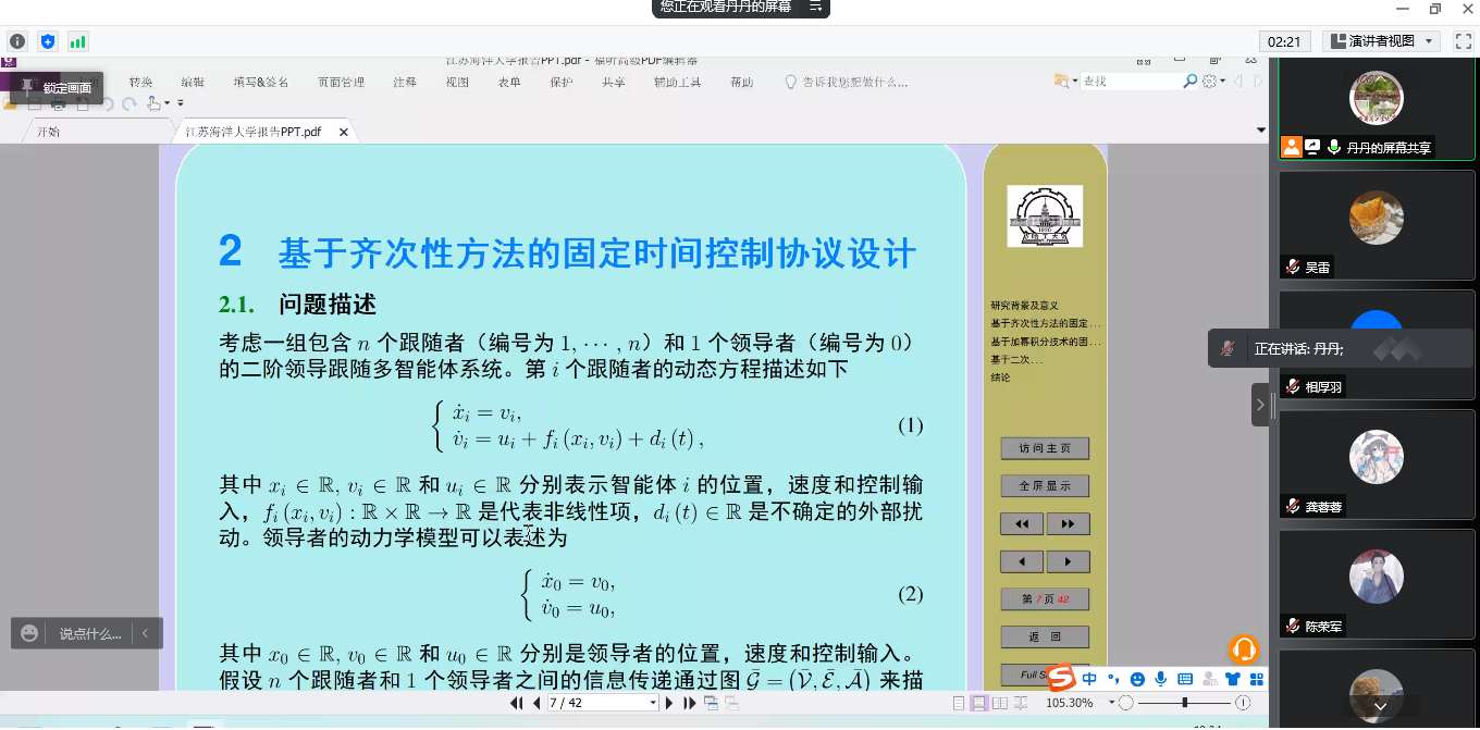 接下来,张丹丹博士从基于齐次性方法的固定时间控制协议设计、基于加密积分技术的固定时间控制协议设计和基于二次型Lyapunov函数的固定时间控制协议设计三个方面为我们介绍相关研究。