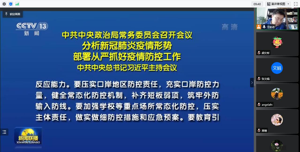 同时教工党员还结合本职工作,针对疫情防控背景下线上教学工作存在的问题、如何维护好线上教学秩序、提高线上教学质量,进行了充分的交流和经验分享;员工党员们表示,理解和支持公司关于疫情防疫的政策与规定,将严格遵守疫情防控相关规定,从自我做起,从身边小事做起,为维护校园安全稳定做出自己的贡献。