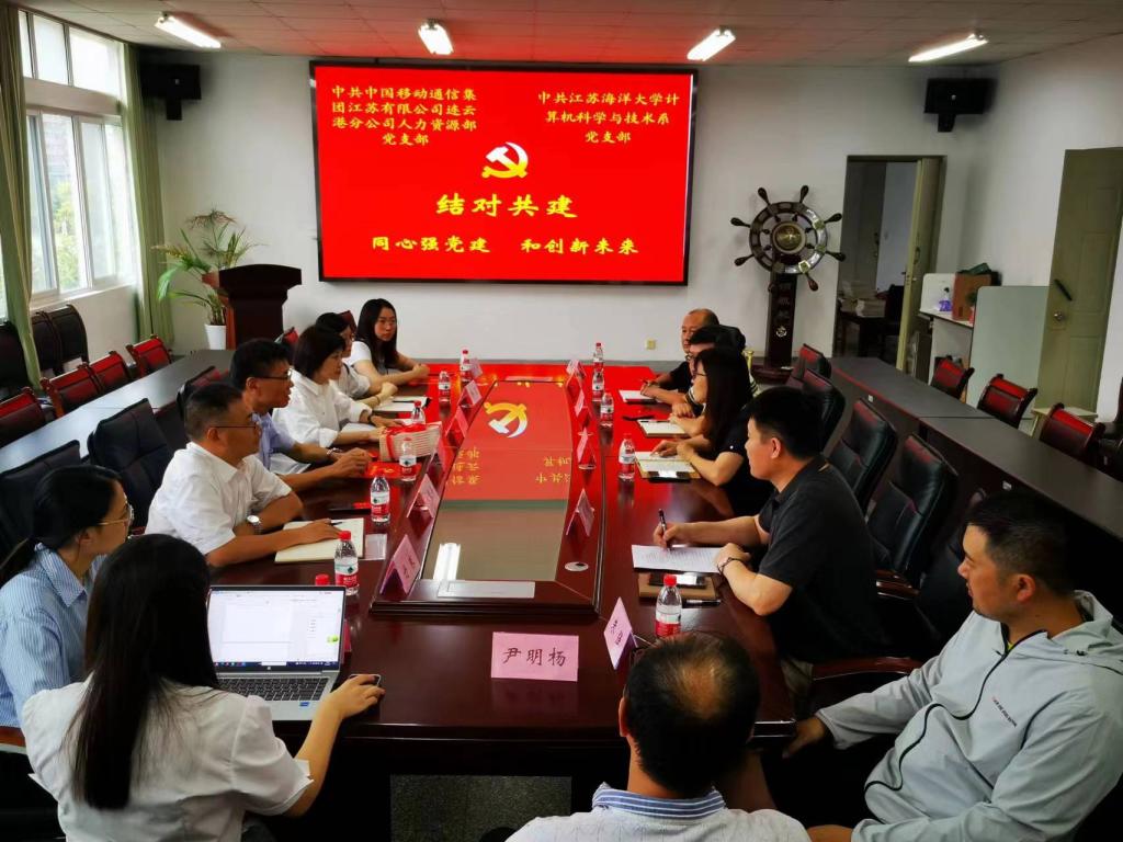 为进一步发挥基层党支部优势,推动党建与业务的深度融合, 9月9日下午,在计算机楼306会议室,计算机科学与技术系教工党支部与中国移动通信集团江苏有限公司连云港分公司人力资源部党支部(以下简称“人力资源部党支部”)开展“同心强党建 和创共未来”结对共建交流活动。公司党委班子成员、计算机科学与技术系教工党支部全体党员参加了此次活动。
