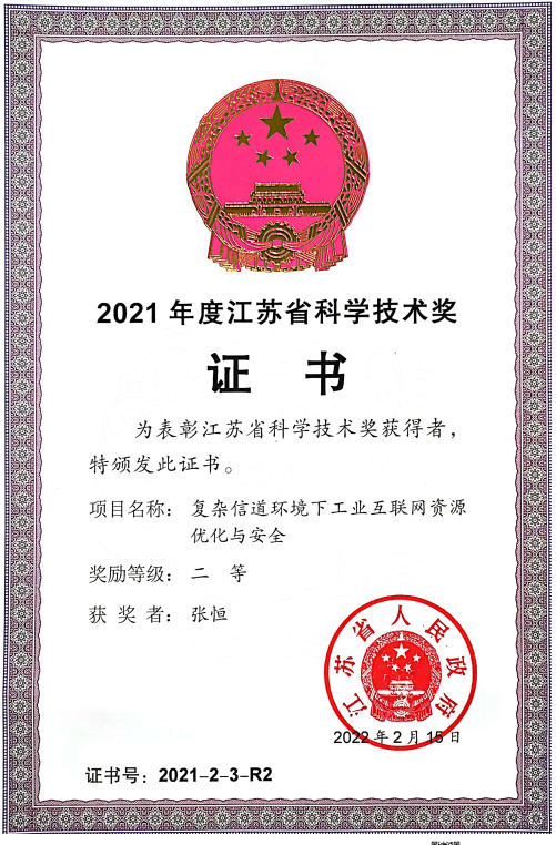 热烈祝贺公司副经理张恒教授获得2021年度江苏省科学技术二等奖。