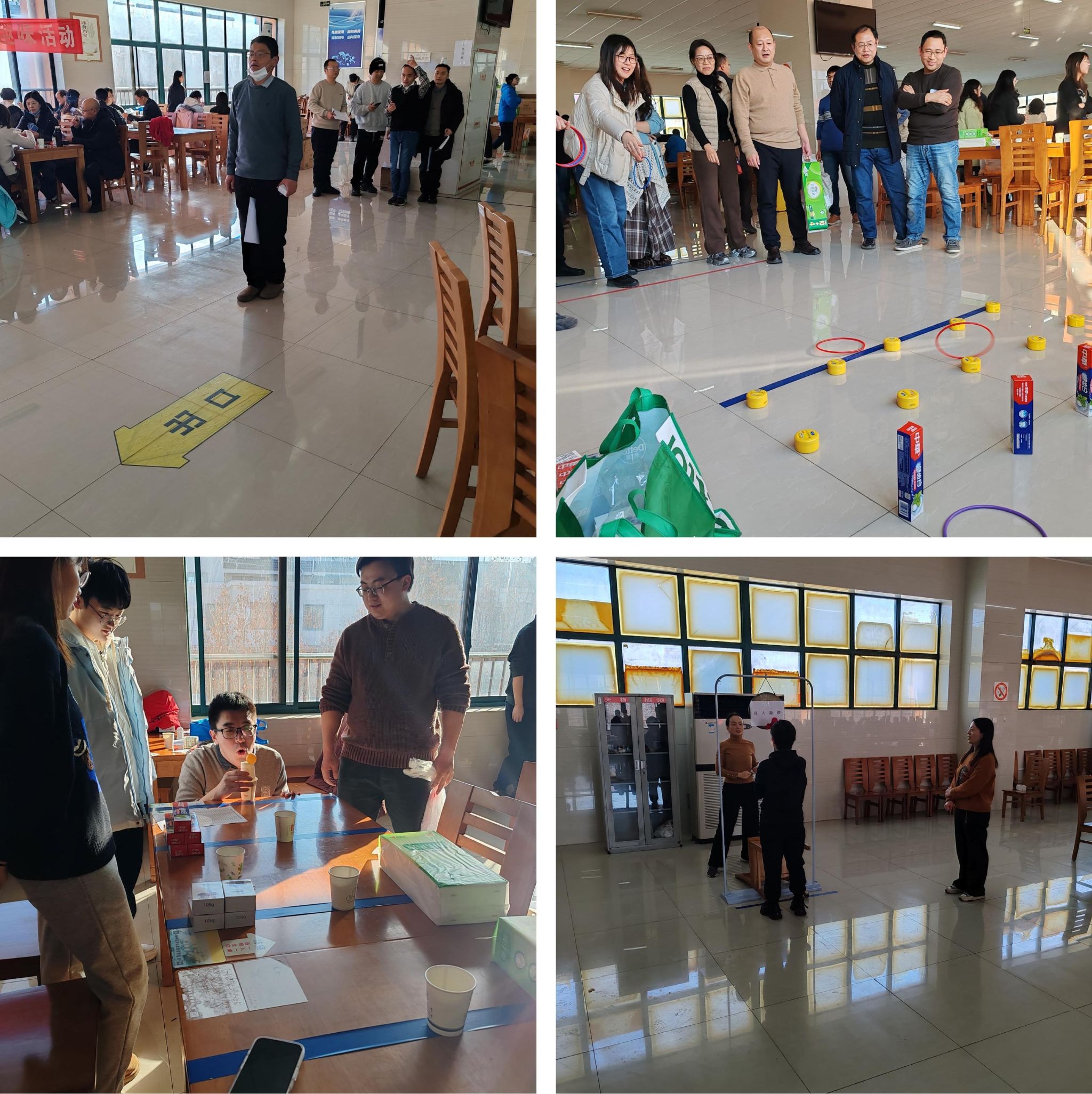 在教职工餐厅,掼蛋、套圈、夹纸顶杯、杯杯等球来、盲人敲锣等项目在欢声笑语中有序开展。活动现场处处洋溢着教职工们爽朗的笑声,气氛轻松而热烈。