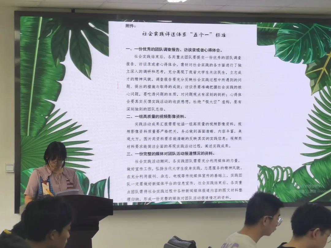 仪式伊始,由各团队队长分别介绍本团队的基本情况:实践主题、成员人数、分工情况、实践时间、实践地点、实践效果目标等。接着,软件192班钮思成宣读了社会实践评价体系的“五个一标准”。随后,唐康老师对各个团队提出了建议和要求,并详细阐述了社会实践评优体系要求及评分细则,要求各个团队按照评分准则做好实践各个环节,力争优秀。