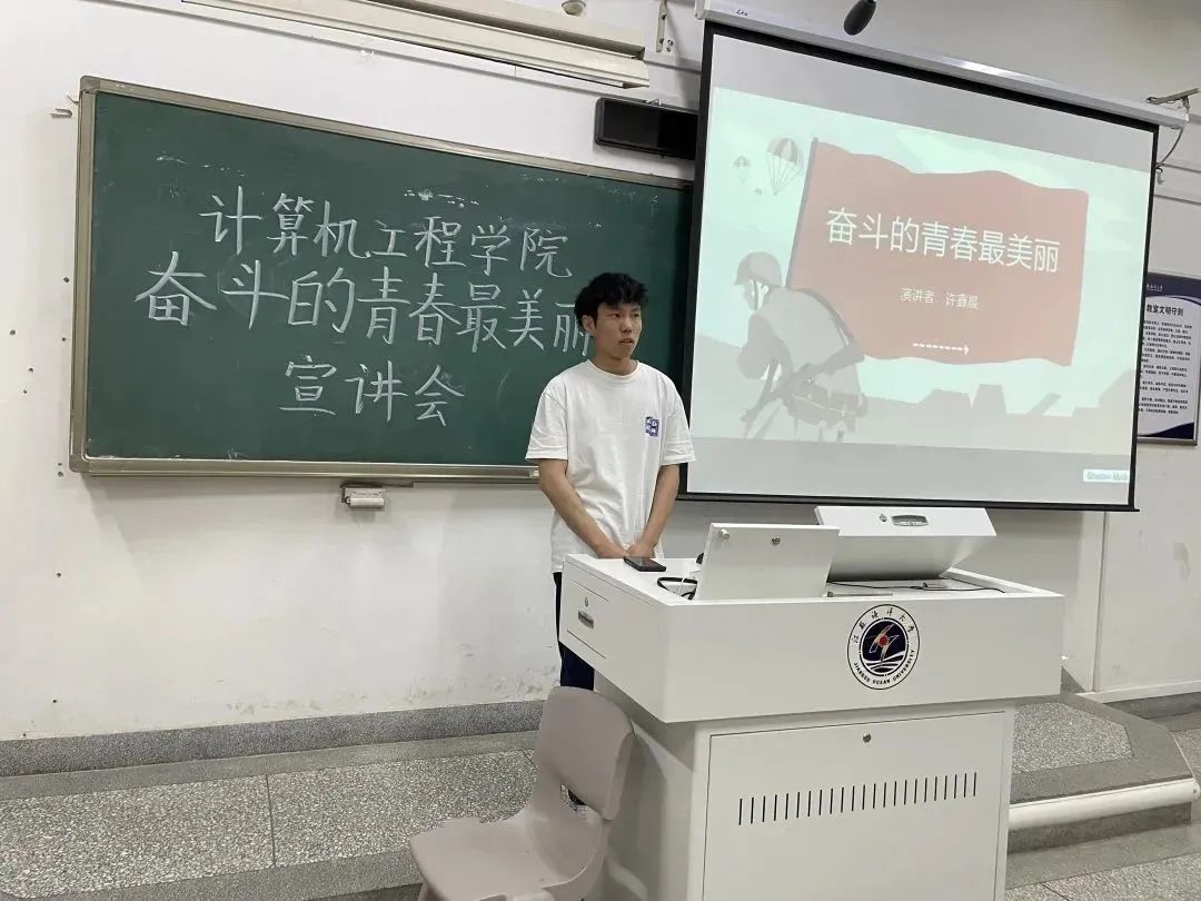 宣讲会上,退役老员工代表来自计算机1211的许鑫晨发言,他用自己的亲身经历和成长收获,讲述了从军报国的初心使命,分享了部队“大熔炉”淬火成钢的青春故事。许鑫晨在祖国西陲新疆乌鲁木齐边远地区部队服役,他讲述了自己军旅生涯的成长与收获,介绍了自己在军营的训练、生活、成长经历和军营感悟以及“以梦为马,不负韶华”投笔从戎的家国情怀,使广大同学真切地感受到军营的美好生活。